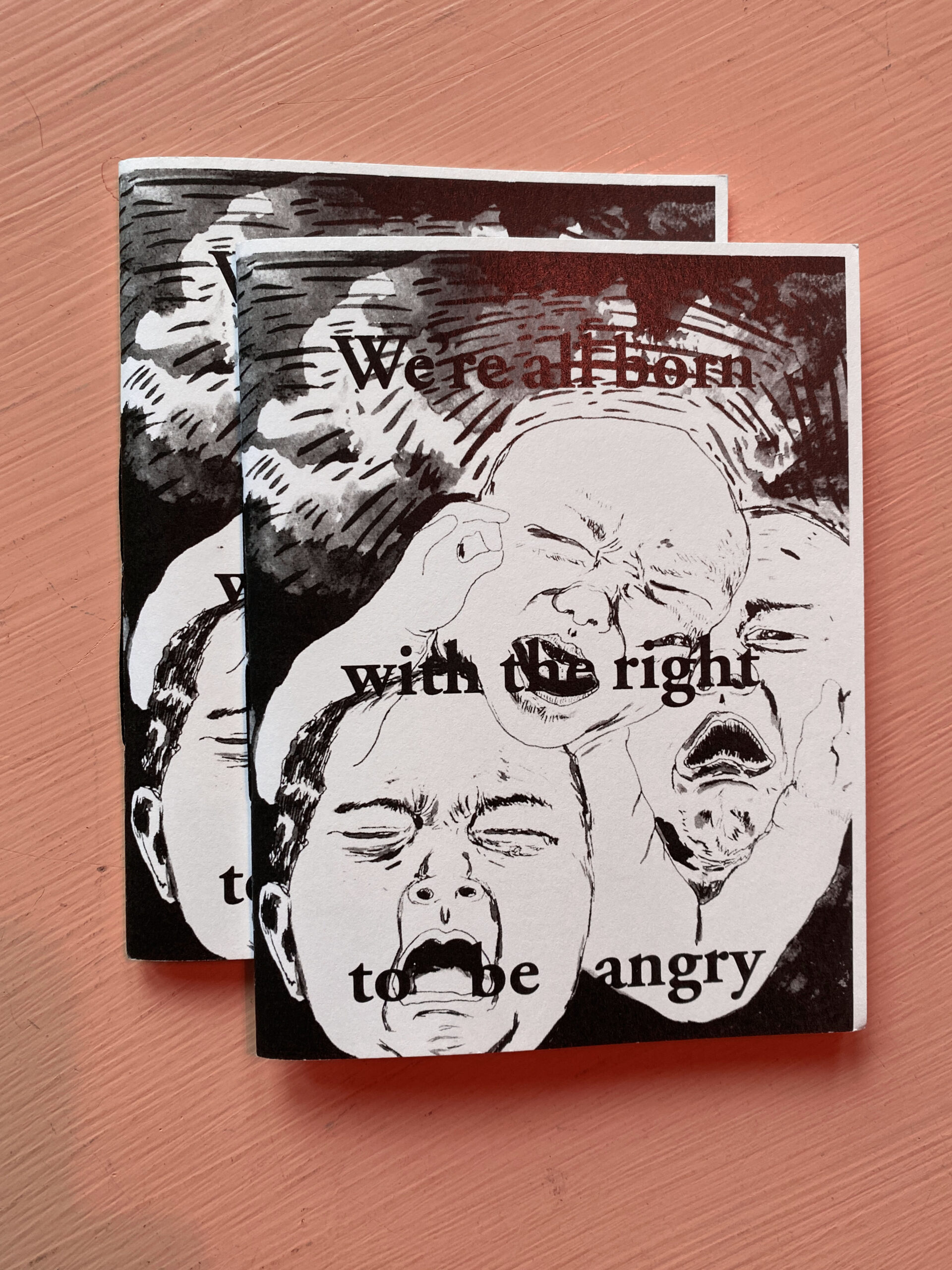 We’re All Born with the Right to be Angry is an agitated rifle through the messes and mazes of growing up female by way of midwestern niceties and loud silences. This is storytelling in bursts, a catalog with the characteristic distillations and arrests of space and breath. The text is moving with the anxiety and catharsis through senile aunt figures and fumbling teenage coming of age in the back of a car parked in the graveyard. The scenes are yours and mine as much as they are Tadeyeske’s; we are tenderly led through the dark and bright blinding shine of it all.